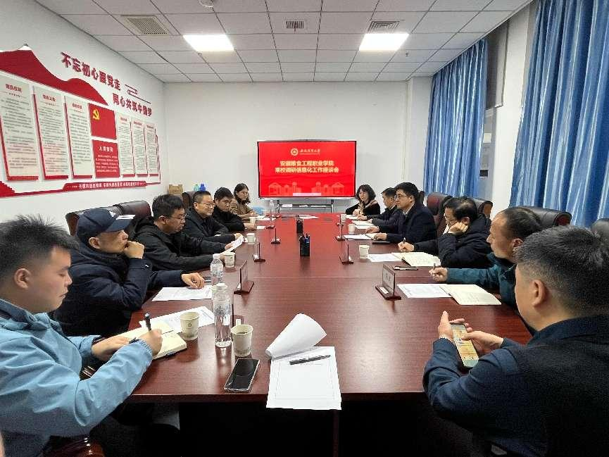 本网讯 12月3日下午,安徽粮食工程职业学院副院长张俊峰一行来校调研信息化建设工作,校数据管理处(信息化办公室)处长吴国卿主持会议。