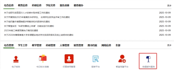 为进一步提升学校邮件收发的管理效率,优化服务体验,学校在深入推进网上办事工作的基础上,由数据管理处与总务部联合推出“给据邮件服务”。该服务主要面向收件地址为学校及下属各单位的给据类邮件(包括挂号信、印刷品挂号、汇款单、小包等)。