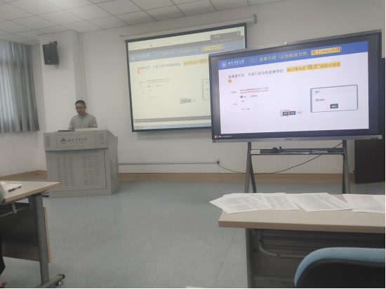 会上,刘世虎主任首先对各单位在电子公章制作及测试阶段给予的积极配合表示感谢,并详细介绍了电子签章服务的总体设计思路与系统架构,重点演示了“数智安农—电子签章服务”的用户申请及办理流程,讲解了办理过程中UKey使用的注意事项。通过现场演示与实操指导,参训师生进一步熟悉了电子签章的使用方法与办理流程。