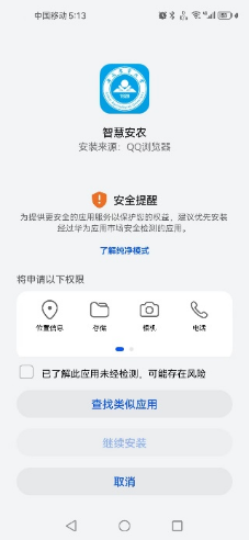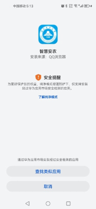 非纯血鸿蒙系统(华为)手机用户关于“智慧安农”APP下载后,点击安装,出现禁止安装或无继续安装字样,无法更新智慧安农版本,如图示: