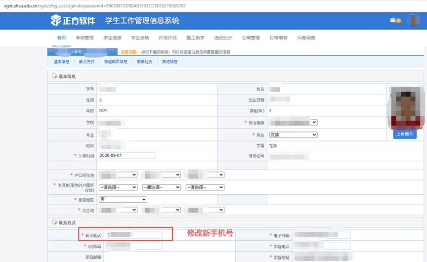 请学生在学工系统-个人基本信息中,修改新手机号;