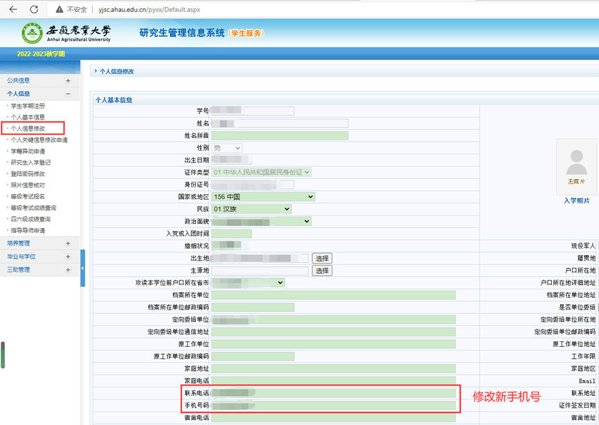 请研究生在研究生系统-个人信息修改中,修改新手机号;