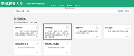 用户进入校园网自服务系统,自主复通账号。通过智慧安农-网络计费,点击服务选项卡-账号复通功能