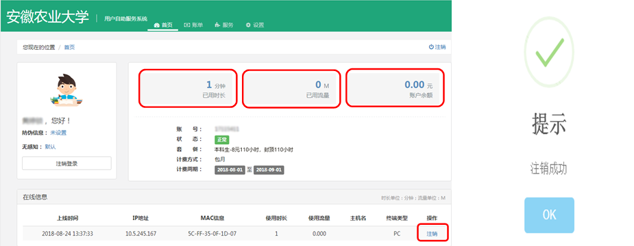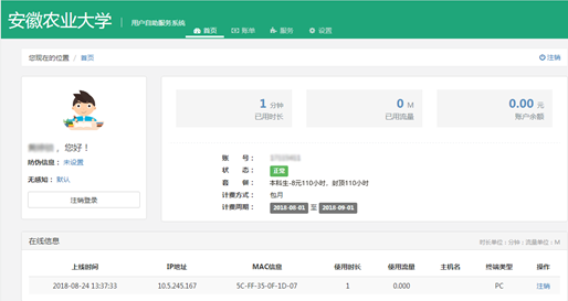 4.“首页-在线信息”可以看到使用正在使用你的账号上网的终端的基本信息,也可注销下线当前在线的终端。