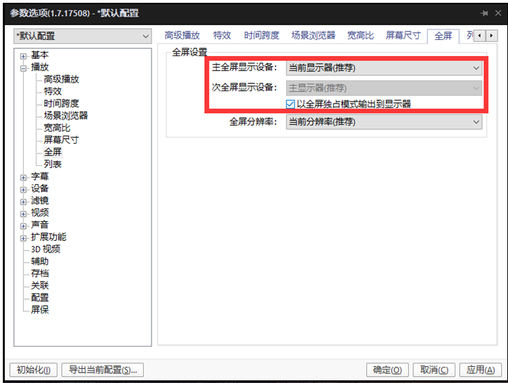 (2) 在播放器界面右键选择【选项】,在【播放/全屏】对话框中设置次全屏显示设备为主显示器、勾选以全屏独占模式输出到显示器。