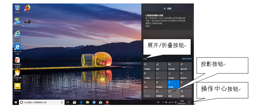 方法2:点击屏幕右下角的【操作中心】按钮,再单击【展开】,选择【投影】。(如果右下角未显示操作中心,网上搜索“win10电脑右下角操作中心图标不见了怎么办?”,自行处理好。)