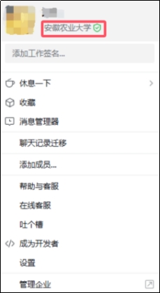 (二)加入企微后,请不要轻易在管理企业中退出“安徽农业大学”以免丢失所有好友、聊天记录等数据。