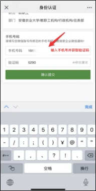(三)在身份认证页面中,填写智慧安农账号绑定手机号及验证码,点击“确认提交”按钮。
