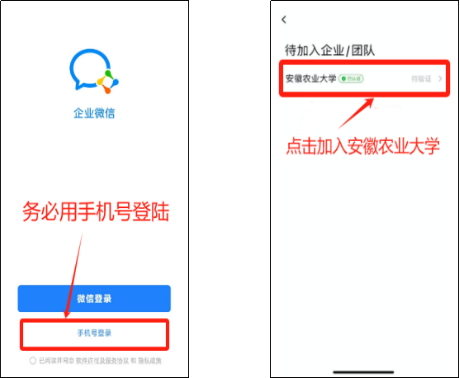 启动企业微信电脑端或移动端,选择“手机号登录”点击选择加入“安徽农业大学”即可。(注意:使用前面认证的手机号登录,使用微信登录有可能会加入到其他非本校的组织。)