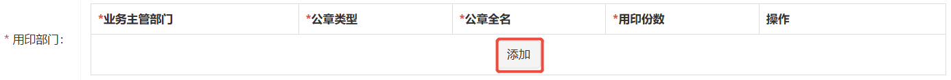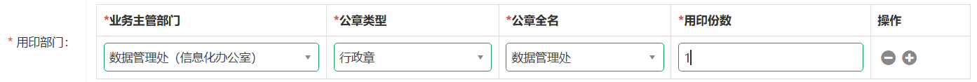 根据需求,选择用印部门及所需公章(单个或多个部门公章,如需选择多个公章点击加号进行选择即可)