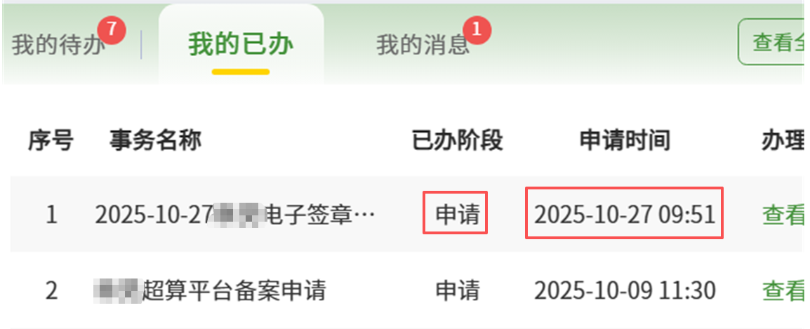 在数智安农-“我的已办”栏目,看到申请处于申请阶段,。