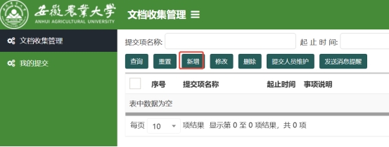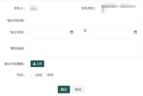 点击新增,配置相关收集内容(发布提交项名称、起止时间、文档模板,是否立即启用等)。
