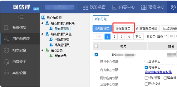 在研究生院后台管理站点-【管理中心】-【用户和权限】-【所有管理员】,查询到需要移除的教职工,勾选后,点击【移除管理员】,移除后,所有栏目权限自动消失。