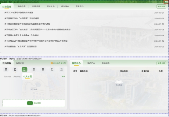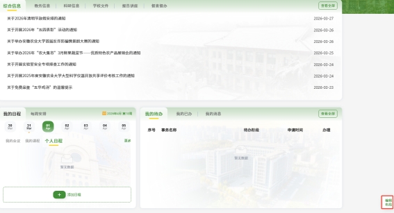 为进一步提升“数智安农”平台的使用体验,平台已正式上线首页个性化布局调整功能。师生可根据自身需求,自定义首页右侧应用模块的排列顺序,并设置显示隐藏状态,打造更贴合个人使用习惯的专属门户。